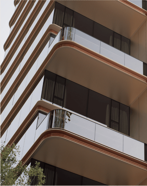 玻璃蔡墙与金属构件有序交织,为建筑披上一件“金缕玉衣”。