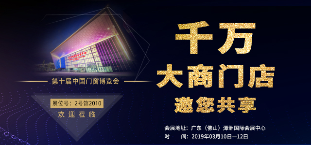 2019年3月第十届中国门窗博览会,被誉为华南门窗展示平台,中国门窗风向标,其展出范围囊括整木定制、定制门窗、定制家居等。商客汇聚一集,行业高峰论坛,全产业链互动盛会,实现多方共赢 。
