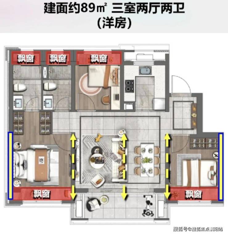 洋房产品为9-10层,建面约89㎡,三房两厅两卫,层高约3.1米,得房率高达81%,全屋共5个飘窗,采光和空间利用率极佳,居住舒适度高。