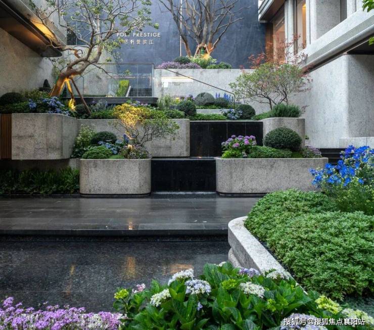 芳汀花园 : 核心水景用了宇宙黑金奢石,纹理深邃如星云,配上四株对称的香橼树,这种“对称美学”极其治愈。