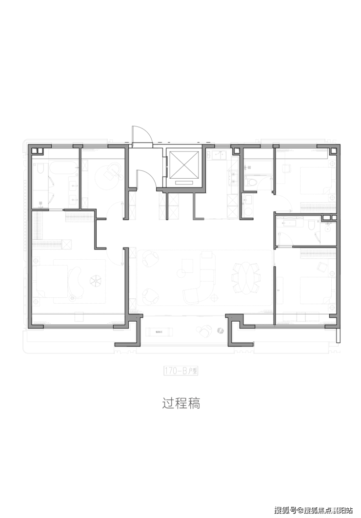 170㎡B户型平墅: 五面宽设计,南向总面宽约17.2米,餐客厅面宽约8.2米。主卧面宽约5.4米,尊崇独立衣帽间,空间阔绰可分男女。三个套房。独立八百库收纳、卫浴收纳拉满。