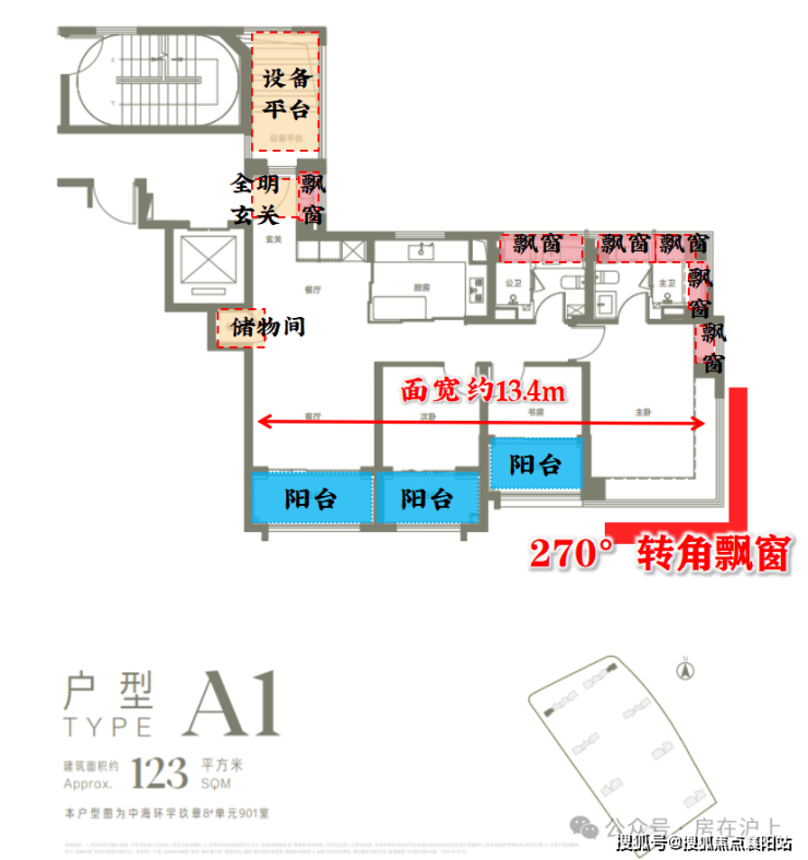 以 建面约123㎡户型 为例,新规红利被运用到极致: 南向四开间、3阳台+6飘窗 的配置,让空间得到极大拓展。