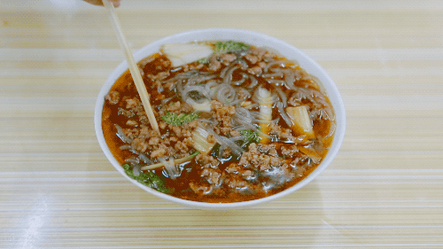 粉条汤做起来极快,上面是一层红彤彤的油和秘制的肉臊,香气浓烈,非常勾人;肉臊颗粒不大,但吃起来艮啾啾的,倍瓷实;粉丝是事先泡好的红薯粉,吸饱了汤汁,超Q弹。
