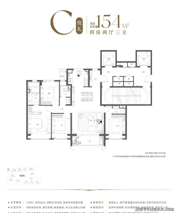 进阶改善四房户型适配二孩多孩家庭多人口大家庭长期一步到位置业。户型做到四开间朝南极致采光格局,全屋四面向阳,南北双向极致通透,室内空气循环通畅,采光通风条件达到优质水准。阔尺公共活动空间,客厅连通宽阔观景阳台,室内视野开阔无遮挡,部分中高楼层房源室内可直接眺望社区滨海海岸生态绿意景观,居家公共空间大气开阔,充分满足家庭聚会休闲社交亲子活动全部多元需求。户型动静分区极致分明,四个卧室分布合理,各个房间私密性极强,家庭成员日常作息互不干扰。主卧独立豪华套房,配套独立卫浴专属衣帽间,空间奢阔舒适,其余多功能房间可以随心灵活改造,书房茶室儿童游乐房储物间全部适配,全屋空间无任何浪费面积,功能分区完善齐全,一次置业终身居住,无需后续频繁置换房屋。