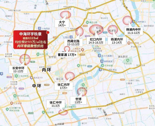 内环内新房普遍12万+/㎡,静安曹家渡约17万+/㎡、虹口14.5-16.5万/㎡;内中环如大宁14万+/㎡、长宁中环旁12-13万/㎡、浦东世博13万+/㎡。