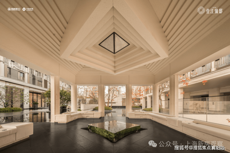 超千方镜面主题水院,时刻演绎自然与建筑的无界之美: 澄澈镜面水面倒映建筑肌理与天光云影,搭配三株原生丛生乌桕的点缀,与回廊、浮岛相映成趣,营造出静谧雅致的亲水意境,这种沉浸式水景体验生活,在张江高端住区中尤为稀缺。