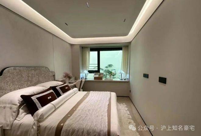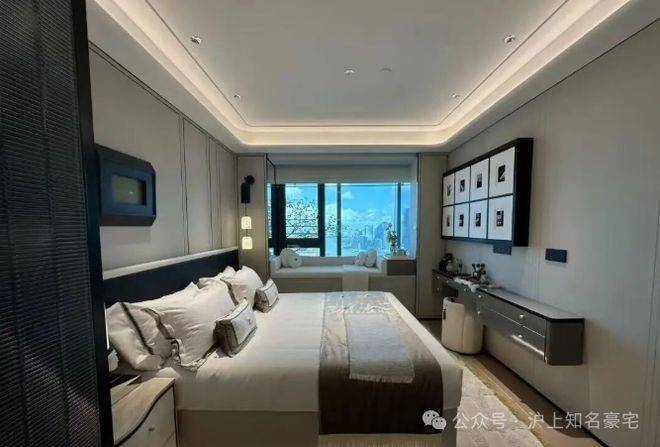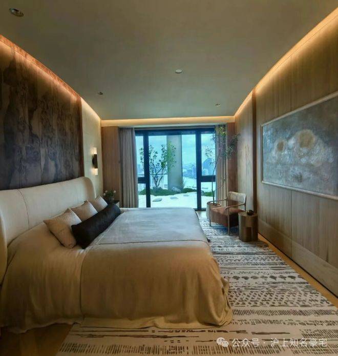 主卧背景墙更以威尼斯安缦酒店同款树瘤木,搭配巴黎宝格丽酒店同源羊皮纸,将全球顶奢酒店的居住质感搬进家中,每一处选材都彰显塔尖人居的高奢基因!