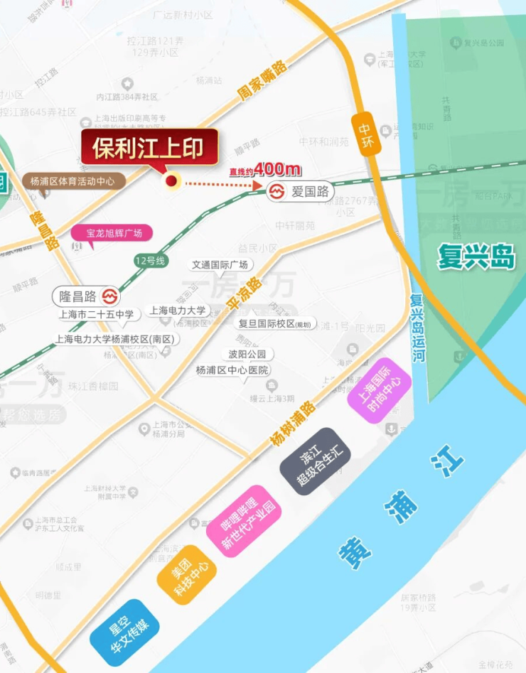 项目约400米可达轨交12号线爱国路站,可以快速串联 北外滩、苏河湾、南京西路、漕河泾等核心商务区,通勤效率直接纳入一线梯队,是真正意义上的地铁房!