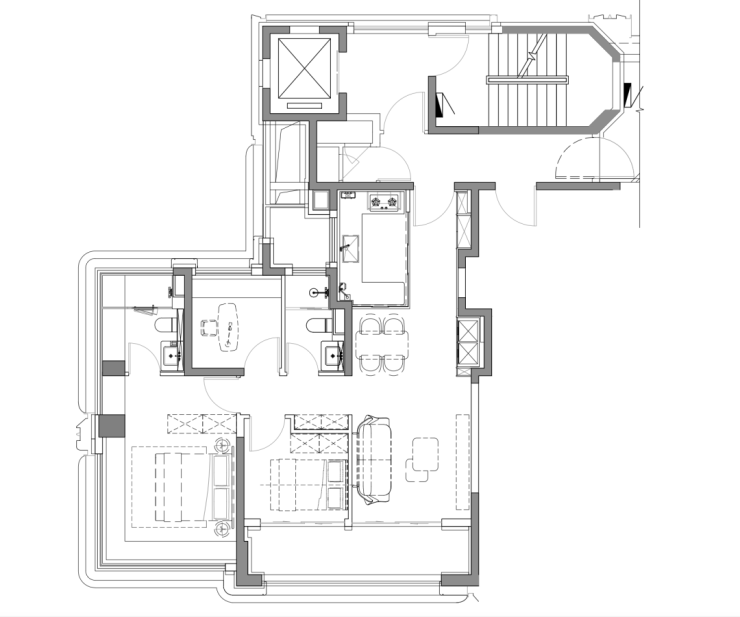 我们以边套的建面约108㎡三房两厅两卫来看。