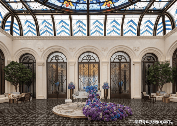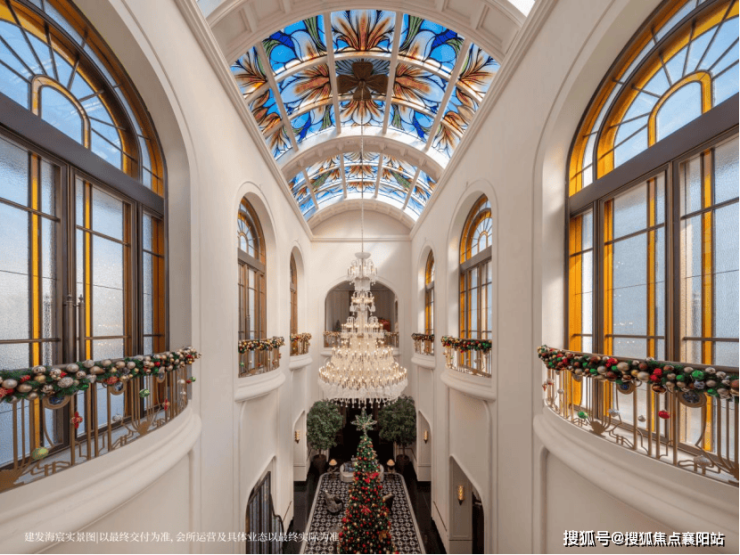 「孔雀厅」同源上海华尔道夫酒店精髓,约14米挑高宏阔大堂,开阔奢华,穹顶巨幕彩绘玻璃,历经团队三轮打样,终成绮丽之景。