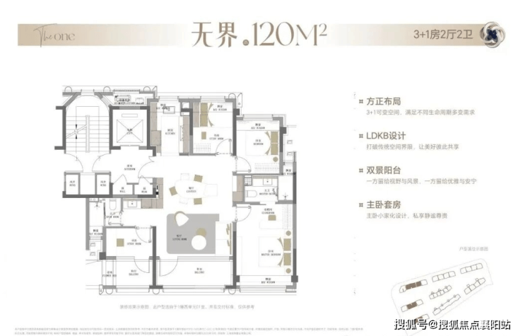 这是项目的爆款明星户型。三开间朝南,南向面宽约 10.5 米,采光面无敌。客厅面宽约 4.8 米,连接约 7.2 米的双联观景阳台,与餐厅形成约 40㎡的 LDK 巨厅,尺度感拉满。3+1 房设计,灵动空间可做书房、儿童房或衣帽间。主卧套房超 20㎡,带独立卫浴与步入式衣帽间。全屋层高 3.1 米,比普通住宅高出 20 公分,空间感与通透感极佳。