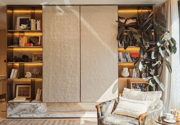 玄关柜被精细化分区,开敞格就在手边,便于随手放置钥匙、包包、手套、帽子等小物件,下方柜体存放常穿鞋子。格子内嵌灯带,采用石材面板与背板,并配有智慧屏,每日专属温馨提醒呵护美好生活。