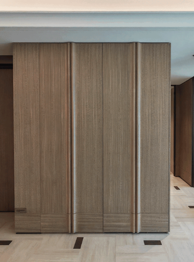 得益于类一梯一户的入户方式,可以将收纳空间向电梯厅延伸,据三万平方测算,此处有长约2.5米的墙面可以利用,作为储物仓或是定制柜子,进一步强化玄关的储物能力。