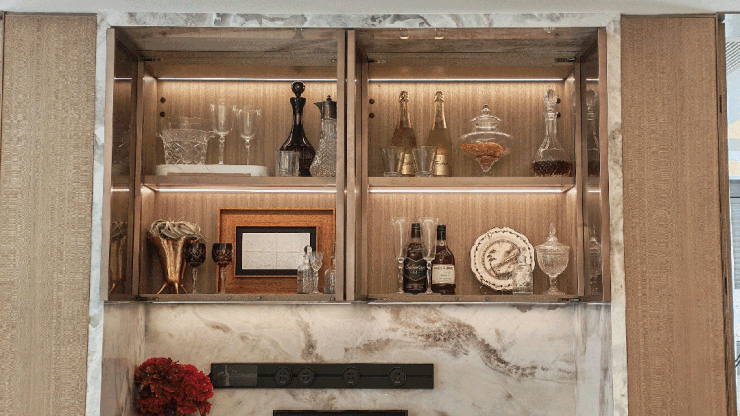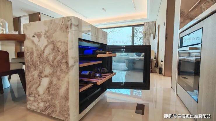 岛台内嵌酒柜,与三五好友把酒言欢,为生活增添更多色彩;或者内嵌抽屉作为简单的收纳,放置纸巾、零食等方便随手拿取。