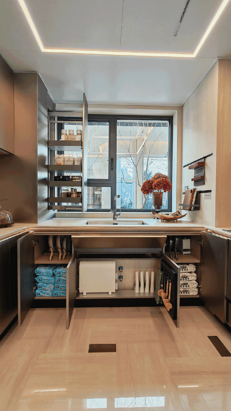 水槽一侧正对整面玻璃窗,空间非常敞亮,感受极好。利用边角空间做了拉篮,不浪费每一寸面积;通过加宽台面,在水池侧边增设了薄柜,收纳清洁布、洗碗刷等小物件;水池下方预留了插座与充足空间,可安装净水器、垃圾处理器等设备;两侧柜体空间也非常充足;侧墙预留有滑轨及插座,方便后续安装刀架、挂篮等,继续扩展置物功能。