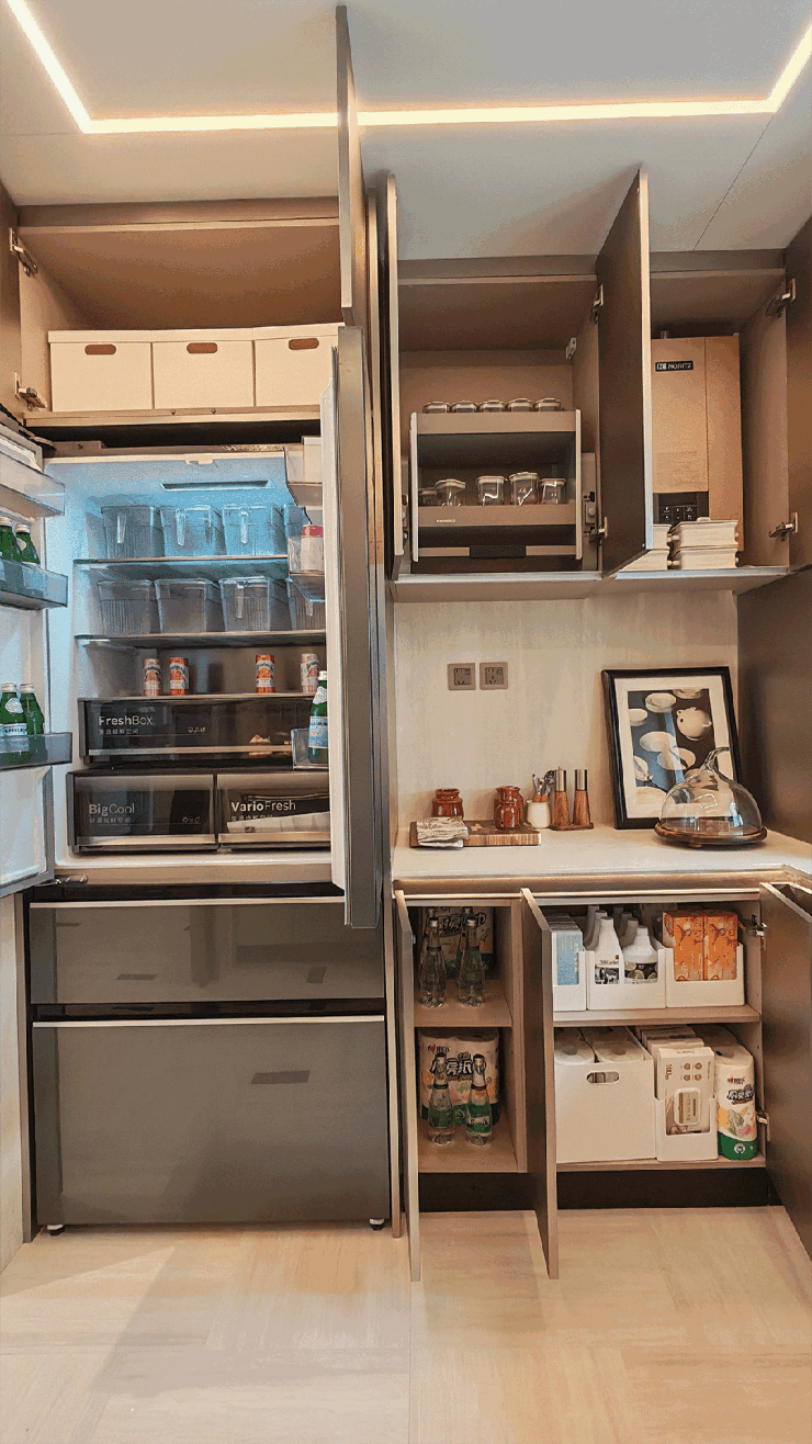 冰箱一侧,双开门冰箱容量500L+,足够大家庭日常储鲜的使用;冰箱上还有储物空间,放置不常用的大件家电等。右侧吊柜内置拉篮,方便女主人对物品的拿取,中间墙上预留足够的插座,方便电饭锅、高压锅等同时使用;下部柜体分层合理,并贴心设置脚踢柜,使用上更加便捷省力。