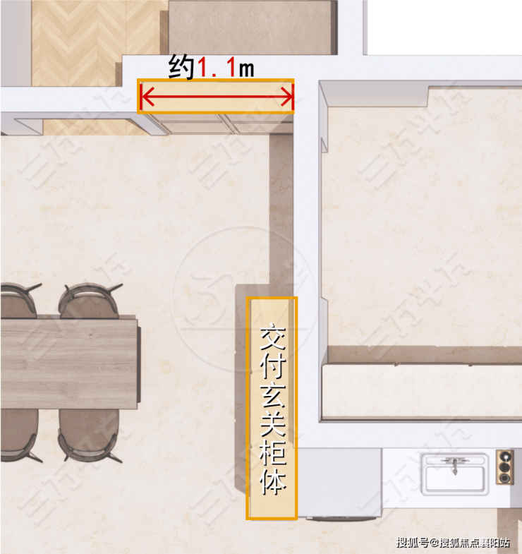 玄关收纳潜力还可进一步拓展。将北侧隔墙北移,又能多出长约1.1米的玄关柜空间,如下图建模所示,将会大大增加玄关的收纳能力。