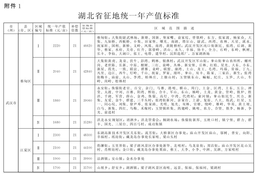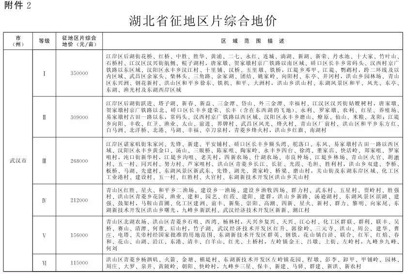 以下引用公文——湖北省征地统一年产值标准和区片综合地价鄂政发〔2014〕12号,是目前执行中的征地政策标准之一,所谓征地,仅仅指的是土地,而非房屋,而地价的变化并不会如同房屋评估价一样迅速变化,所以别随口说怎么用几年前的标准啊……