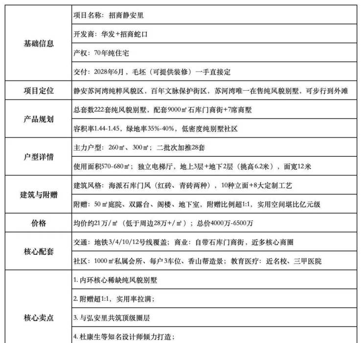 作为上海第二批风貌保护街坊,静安里由华发股份与招商蛇口两大国企联袂匠造,是继弘安里、桐安里之后,“江河三里” 风貌住宅系列的压轴之作。项目总占地面积约 5.2 万㎡,总建筑面积约 14.9 万㎡,综合容积率仅 1.44,绿化率高达 35%,规划 46 栋 2-3 层纯别墅产品,全盘仅 222 席限量席位,70 年住宅产权,全人车分流设计,车位配比高达 1:3,彻底颠覆城芯墅居停车难题,匹配顶奢居住格调。