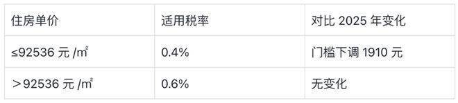 根据上海市统计局数据,2025年全市新建住宅销售均价为46268元/㎡,按照“分界线=上一年度均价×2”的法定规则,2026年税率分界线最终定格在92536元/㎡。这意味着,更多中高端住宅将适用0.4%的低档税率,购房家庭的税负压力进一步减轻。
