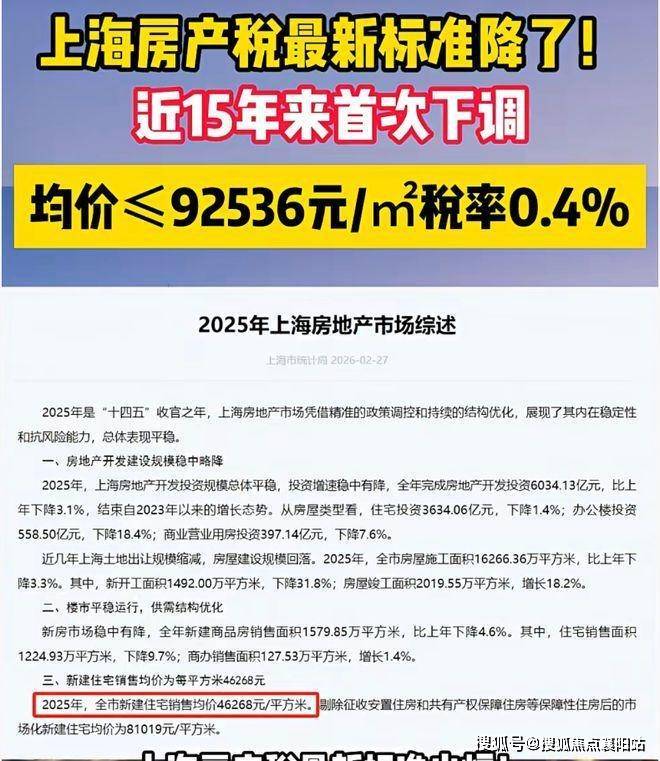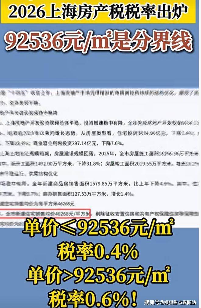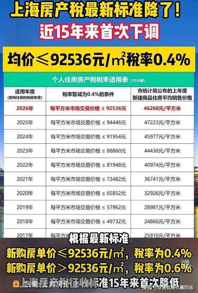 2026年上海楼市传来重磅利好!继“沪七条”放松购房资格后,个人住房房产税政策迎来关键调整——税率分界线从94446元/㎡降至92536元/㎡,降幅近1000元/㎡。这是自2011年上海试点房产税以来,第三次出现分界线下调(前两次为2012年、2018年),也是2018年后的首次下调。