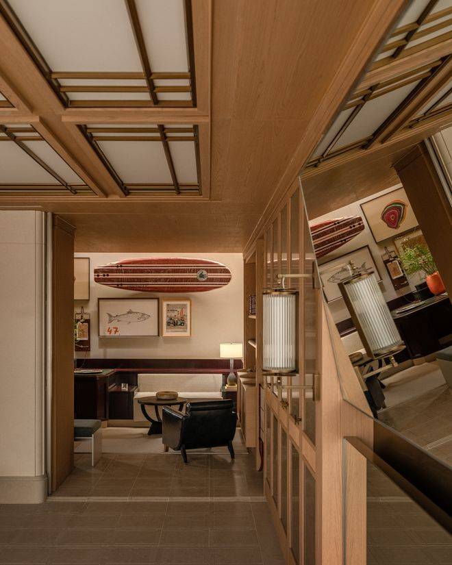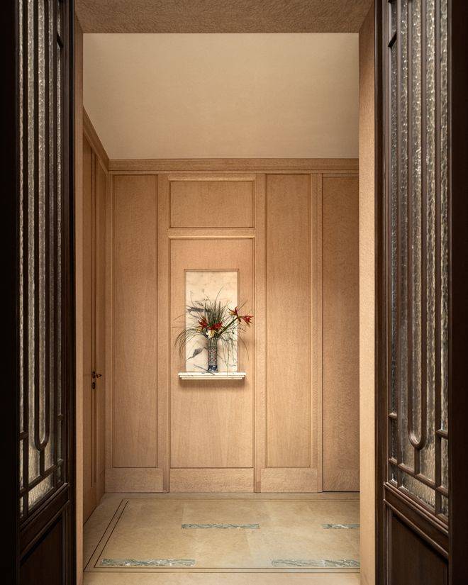 整体布局采用向心式的“打开”策略,会客区使用木地板拼花,私宴区则使用更符合场景的石材拼花。