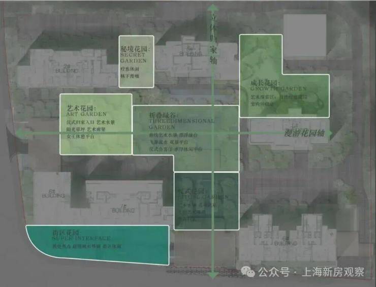 设计灵感源自新加坡艾迪逊酒店与《天空之城》“漂浮的拉普达”,以 “双轴五园” 为架构,打造约108米南北立体归家轴、约90米东西漫享花园轴,串联仪式花园、下沉庭院、儿童乐园、秘境花园、艺术花园五大花园。