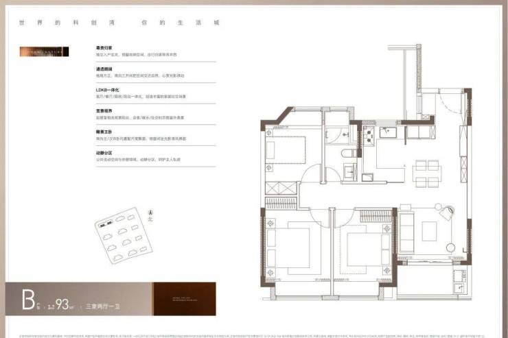 户型亮点 :三开间朝南,南向总面宽达 10.2 米,LDKB 一体化设计,衔接约 1.8 米宽景阳台,采光、通风、视野拉满;主卧带飘窗,双次卧空间灵活,可改造为儿童房、书房,适配三口之家与二胎家庭初期需求;得房率高达 82%,空间利用率拉满。