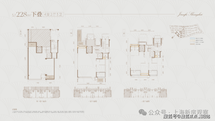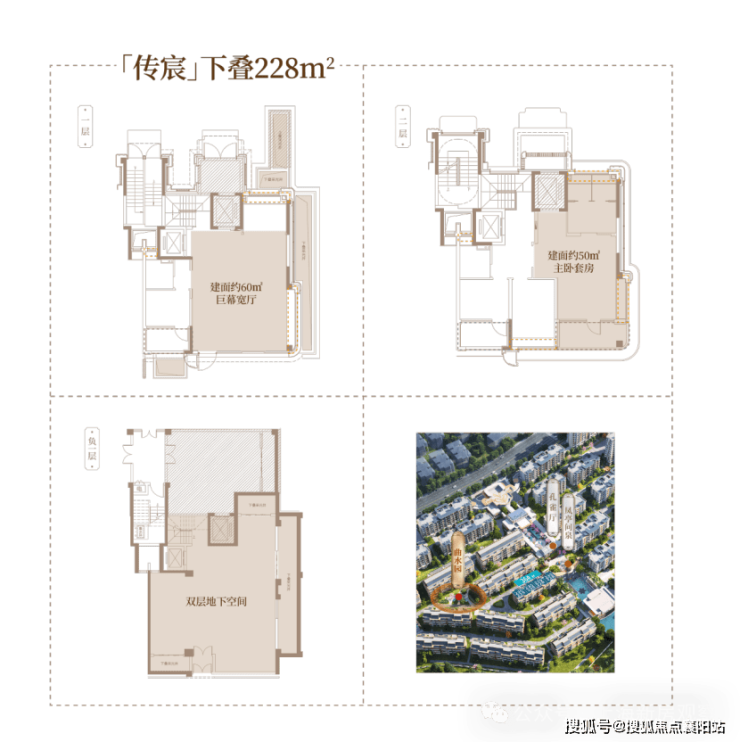 「传宸」下叠228㎡,拥享建面约110㎡南向花园(边厅)、建面约60㎡巨幕宽厅、建面约50㎡主卧套房以及建面超200㎡双层地下空间,一层一境,进阶三代阖居生活;