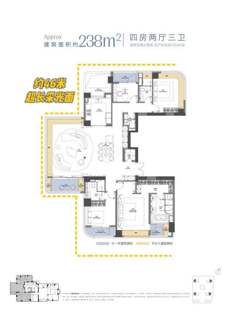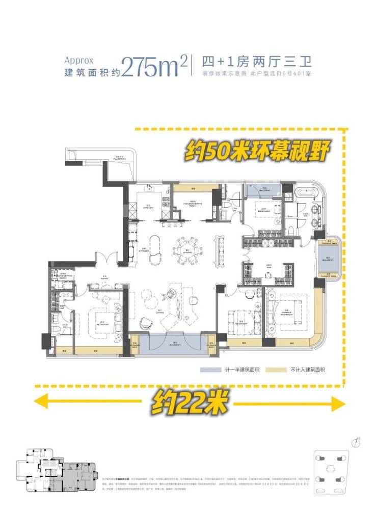 275㎡户型 全屋约50米环幕视野,南向约22米采光!