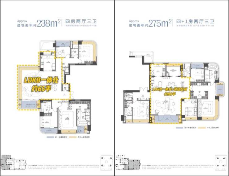 238㎡的LDKB一体化社交厅 约65㎡, 承载的不仅是家族聚会,更是塔尖圈层的社交主场。而278㎡LDKB一体化厅 约80㎡, 单客厅开间约7.2米,尺度感直接提升了一个维度。