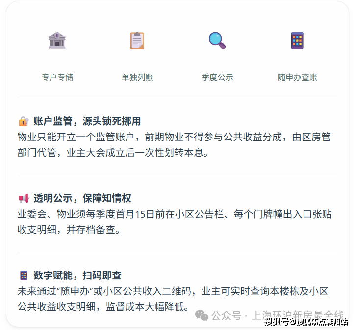 长期以来,电梯广告费、停车费、公共场地租金等“公共收入”成了困扰业主的“糊涂账”。 如今,上海正式出台《上海市住宅小区公共收益管理办法》,建立监管账户制度, 让每一分公共收益都“入账为明,用款有据”。