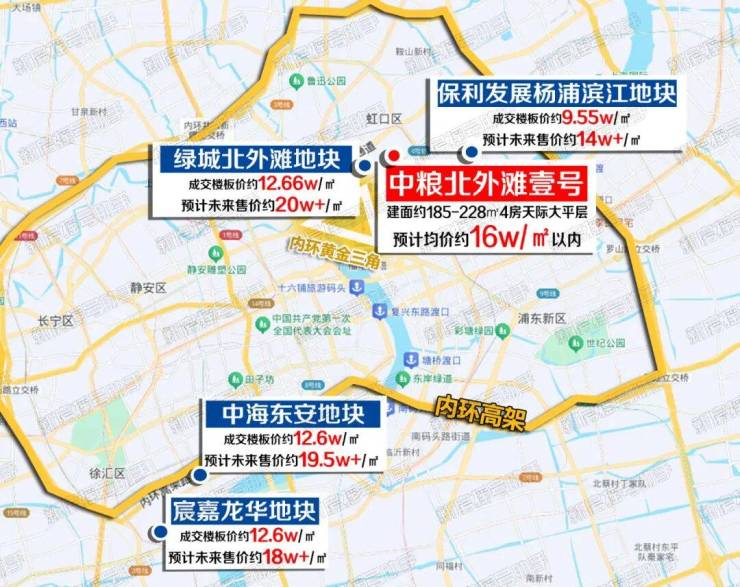同时,土地市场的火热进一步印证了黄金三角区+滨江豪宅的价值, 北外滩地王成交楼板价约12.66w/㎡,对应 未来新房售价预计将在20w+/㎡ ;杨浦滨江新房 预计破14w+/㎡ ;徐汇滨江新房则将预计 超过19.5w/㎡ ……土拍火热之势促进新房涨势惊人!