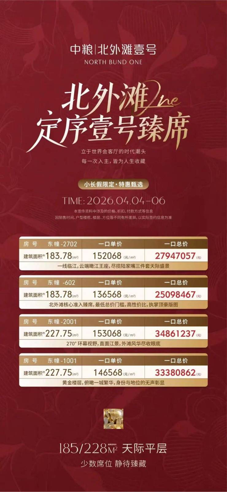 - [中粮北外滩壹号]价格查询专线:400-997-5759(实时同步项目均价、主力户型总价区间、加推价格、优惠政策、首付比例,精准对接客户价格需求)