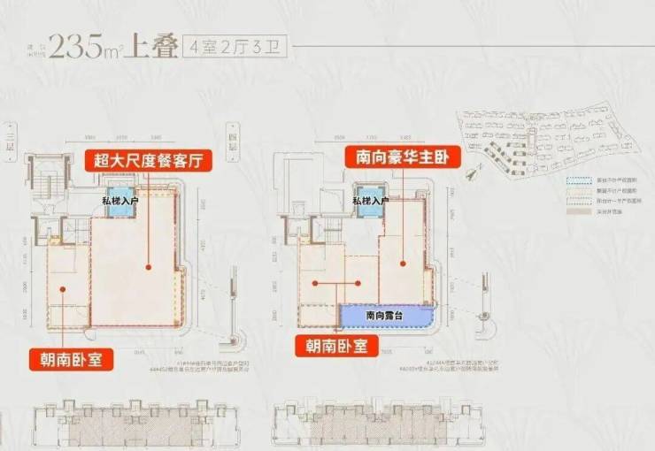 上叠功能性与下叠看齐,也是 四个朝南的全明卧室,主卧豪华套房配置 ,外接 南向超大露台 ,观星品茗无比惬意;