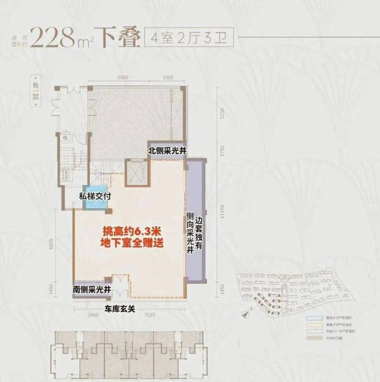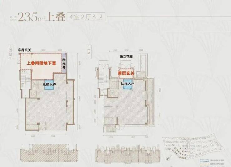 首先,上叠是北向 私享入户花园,独门独户,室内私家电梯 ,尊崇感与私密性都有保障。而且上叠也有地下空间,下单层面积约55㎡,层高达约6.3米,完全做可以做双层使用。