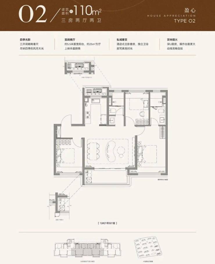 该户型格局方正、全明通透,动静分区明确,客厅连接宽景阳台,采光充足、视野开阔,推窗即可欣赏社区景观,闲暇时可在阳台养花种草、晾晒衣物,兼顾实用性与惬意;主卧空间充足,搭配大飘窗,提升居住舒适度,同时保障主人的私密空间;两个次卧空间适中,可作为儿童房或客房,满足家庭不同需求,无论是三口之家,还是偶尔有亲友来访,都能轻松应对;明厨明卫设计,采光通风俱佳,避免潮湿阴暗,提升居住便捷度与舒适度;餐客一体设计,开阔大气,可容纳家人聚餐、朋友小聚,彰显生活格调;空间利用率极高,没有多余的浪费,每一寸空间都能发挥最大价值,贴合刚需家庭的居住需求。建面约110㎡三房,是刚需改善家庭的核心选择,空间更开阔、配置更优质,兼顾舒适度与实用性,让业主在享受便捷生活的同时,拥有更高品质的居住体验。