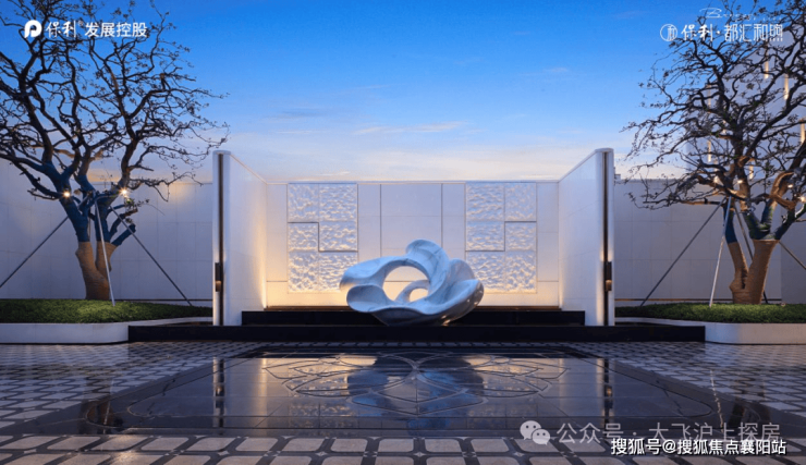 项目打造了约4米高、总长约350米的社区华墙,搭配约70米的星级大门,大门采用贝金米黄石材与玉兰花雕塑装饰,门厅处设置透光云石,整体归家入口的质感出众。