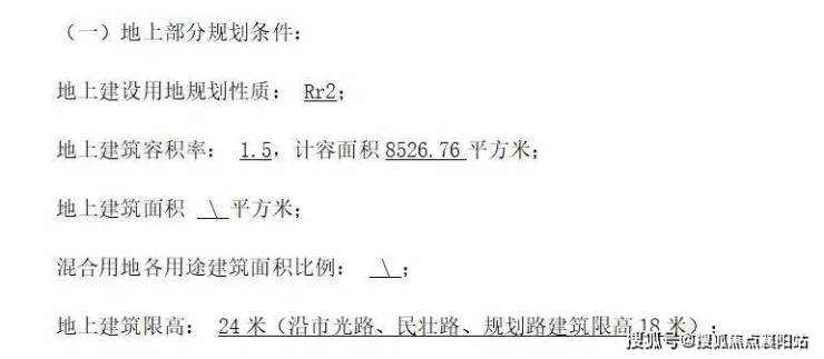 根据出让内容,该地块建筑面积只有约8526.76㎡,容积率为1.5,地上建筑限高为24米,其中沿市光路、民壮路、规划路建筑限高18米。