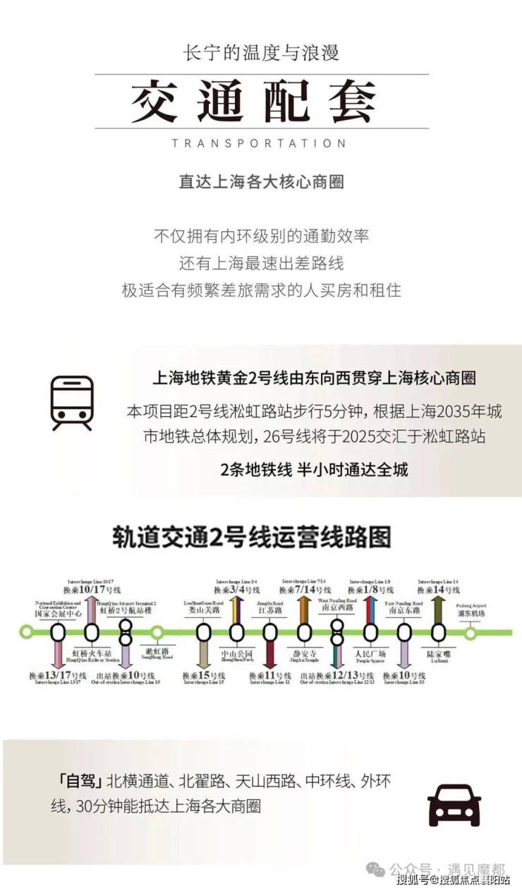 轨道交通(核心优势) :步行约 600 米直达 地铁 2 号线淞虹路站 ,2 站直达虹桥枢纽、5 站直达中山公园、8 站直达人民广场、10 站直达陆家嘴,无缝衔接 1/3/4/7/10 号线等主城轨交, 30 分钟覆盖静安寺、徐家汇、张江 等核心商圈。未来 2 号线西延伸段通车后,通达性将进一步升级。