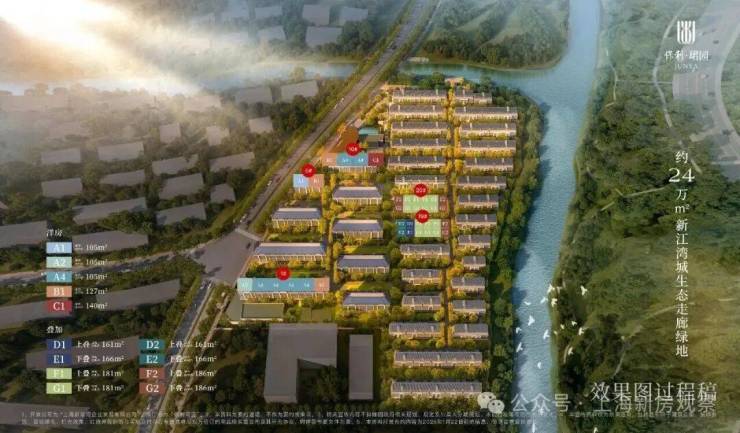 地块本身就处于新江湾城湿地和水系包围之处,从小区的楼栋分布图来看,滨河的基本都是大面积的联排别墅产品,景观应该相当不错。
