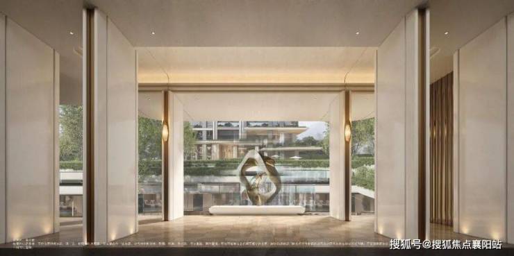 从内江路上的 街区花园超级界面 开始, 层叠岛屿与叠水 彰显艺术张力! 高约6米、宽约30米的仪式大门 ,灰白石材搭配弧形曲线,5米落地玻璃门与悬浮大飘檐尽显尊贵。