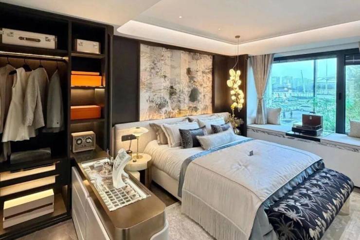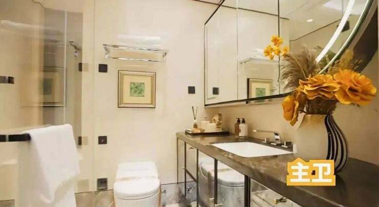 电视背景墙选用意大利超白洞石材;卫生间台面及墙面采用 芬迪白 ;来自巴西进口的静雅棕石材在有些顶豪中仅用于卫生间点缀,而在绿城黄浦ONE,则将其大量运用于地面铺装。