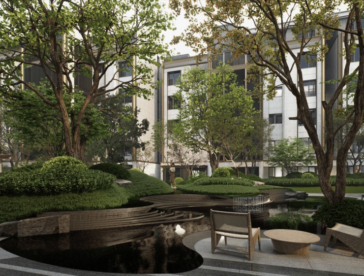 景观打造赴-迎璞径、游-沐溪屿、品-藏画庭的三重景观空间,同时也是归家的三重仪式体验。