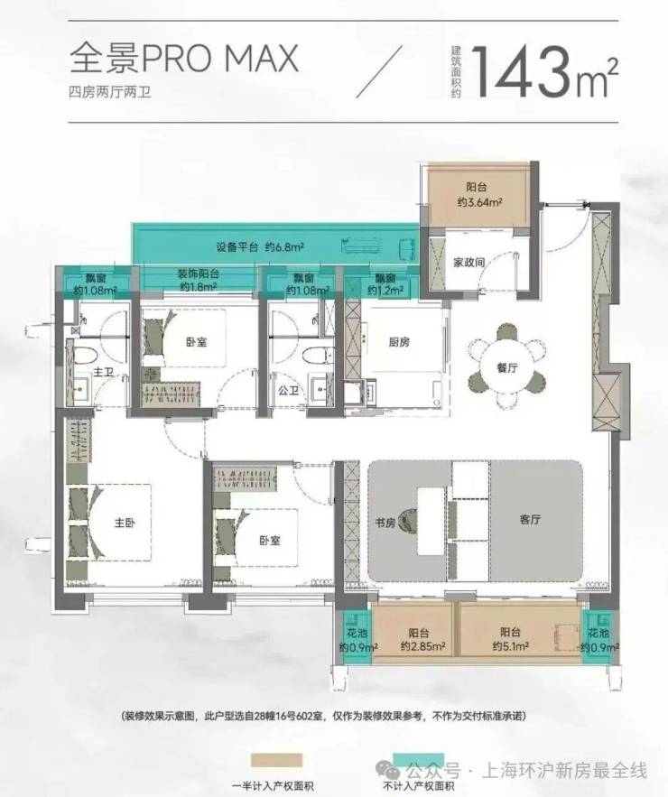 以105㎡的户型为例, “三阳台”搭配花池的设计 ,直接性价比拉满,按照规定: 阳台计一半面积,花池不计面积 ,加上 主卧+卫生间还带飘窗 (主卧飘窗非承重结构),如此算下来,对购房者而言,日常可以实打实 利用到的面积是远超市面上其他三房产品。