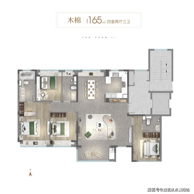 166-177 平方米四房两厅三卫,是终极改善主力户型,总价约 1360-1450 万起,做到四开间朝南、约 7-8 米横厅、南北通透、LDKB 一体化,空间感极强,南向超大观景阳台,俯瞰中央绿地和社区园林,视野无敌。双主卧套房设计,两代人居住互不干扰,私密性强,厨房采用深 U 型设计,中西厨可自由规划,搭配博世、利勃海尔等国际一线品牌厨电,烹饪体验高端舒适。四个房间都方正实用,可满足老人、孩子、客人、书房、储物等多元需求,全屋精装交付,品质过硬,细节考究,是中环改善家庭一步到位的理想选择。