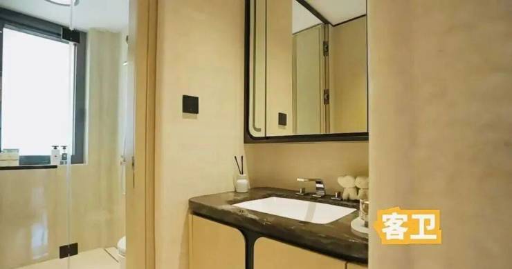电视背景墙选用意大利超白洞石材;卫生间台面及墙面采用 芬迪白 ;来自巴西进口的静雅棕石材在有些顶豪中仅用于卫生间点缀,而在绿城黄浦ONE,则将其大量运用于地面铺装。