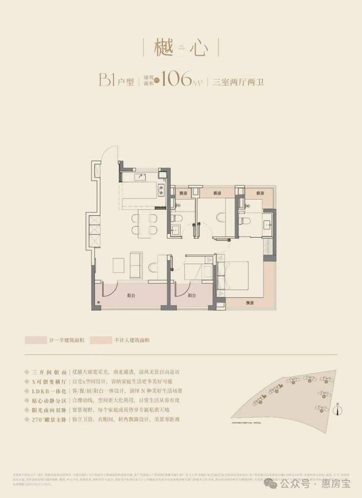 下图为边套户型,中间套户型南向为三阳台,主卧无270°窗!
