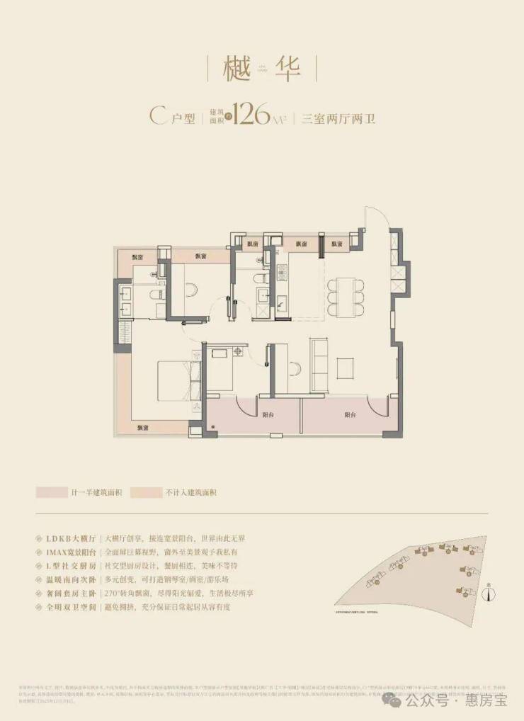 经典动静分离户型,3.5开间朝南+双阳台,阳合仅计算一半建筑面积,主卧以及主卫附赠270°转角飘窗,次卧附赠飘窗且无墙垛!