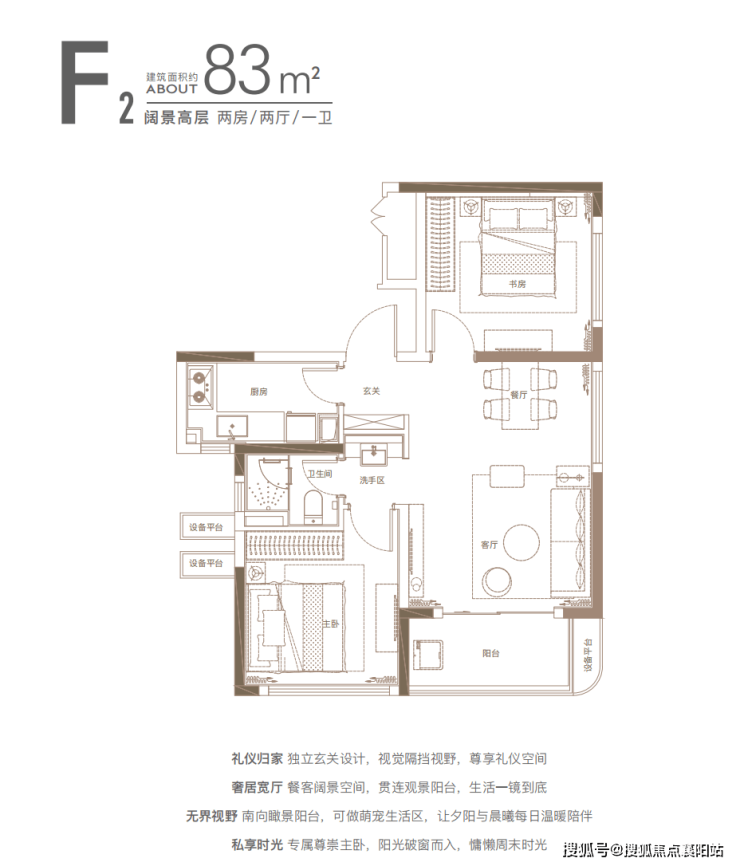 83㎡两房,总价827-850万,适合小两口或三口之家,两开间朝南,采光充足,客厅连接阳台,一半用来休闲、一半用来晾晒,特别实用,主卧带飘窗,空间宽敞,次卧也足够使用,不管是当儿童房还是客房,都很合适,得房率高,住着不拥挤。